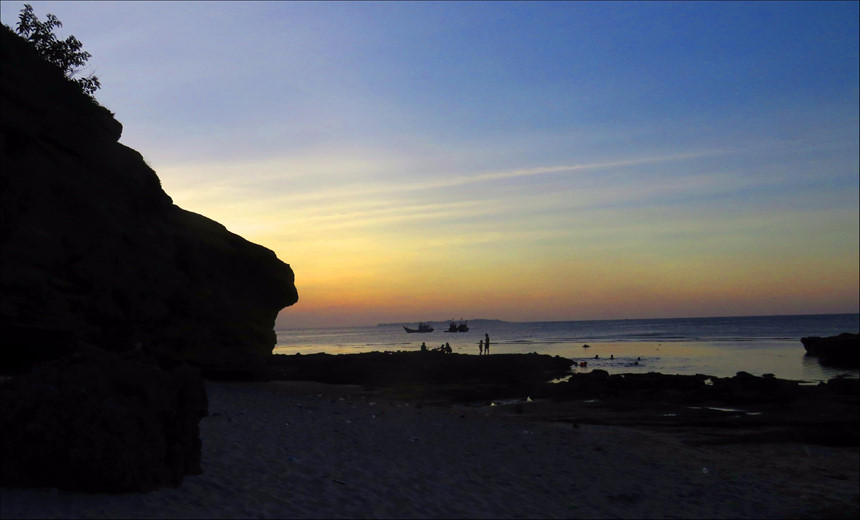 Nhìn từ Chùa Hang, hoàng hôn buông xuống, từ từ loang ra mặt biển, tạo nên khung cảnh thơ mộng, bình yên nơi đảo xa. Ảnh: Phê Hát.