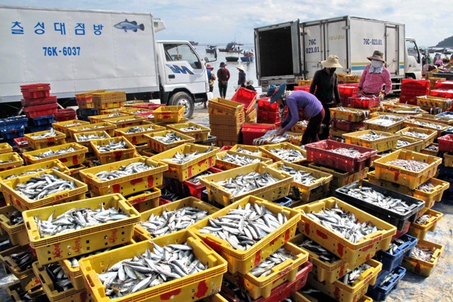Thu mua hải sản tại bến cá xã Bình Châu, huyện Bình Sơn, Quảng Ngãi.