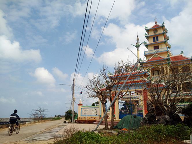 Điện thờ Phật mẫu Lý Sơn (Thánh thất Cao Đài) nhìn ra âu thuyền – Photo: Tr.TBên dưới cổng Tò Vò, ông Lê Văn Nam (55 tuổi, nhà ở khu 10 An Vĩnh) đang lui hui xúc vụn san hô về cho vào chậu cây cảnh. Ông Nam cho biết chỉ nghe nói đến dự án làm kè biển nối từ cổng Tò Vò đến chùa Hang ở phía đông của đảo thuộc xã An Hải.