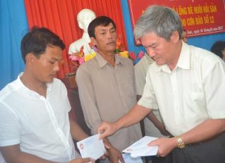 Trao tiền hỗ trợ cho các chủ lồng bè nuôi trồng thủy sản khắc phục hậu quả do bão số 12 gây ra.