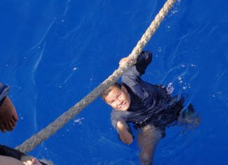 “Rái cá” Bùi Văn Chung giây phút được tàu HP17 vớt lên từ biển - Ảnh: Chu Văn Túc